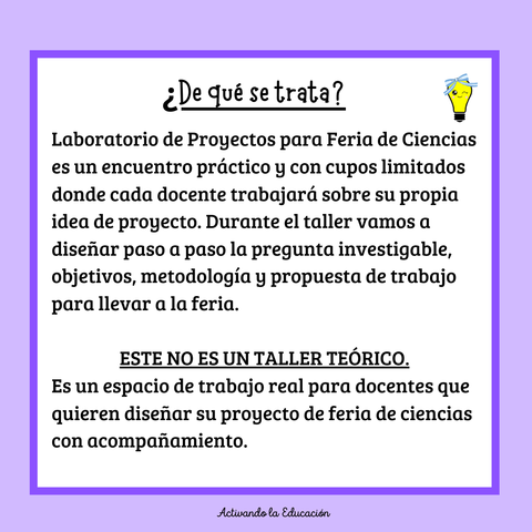 Es un espacio de trabajo real para docentes que quieren diseñar su proyecto de feria de ciencias con acompañamiento.