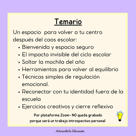Trabajaremos con ejercicios simples de introspección, recursos para regular emociones, herramientas creativas para bajar a tierra y un pequeño ritual de cierre para iniciar las vacaciones con calma y claridad.